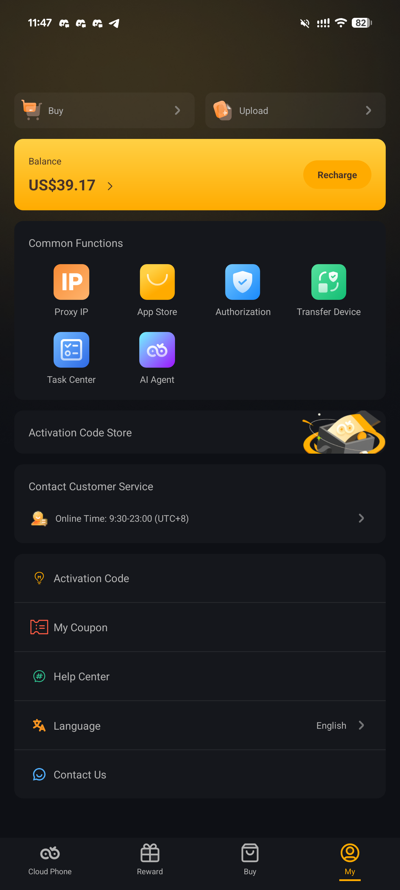 Login ke aplikasi VSPhone, lalu buka menu My → pilih Activation Code.